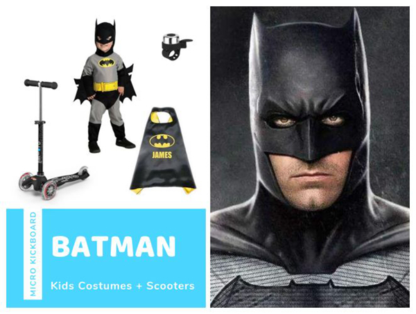 蝙蝠侠的豪华坐骑当然是黑色micro迷你豪华版滑板车。超级英雄总会有些小武器,在你的滑板车上安装一个micro铃铛(要黑色才够酷炫!),让铃铛在路上为你开路。想要让戏服更专属更精致,还可以在披风上绣上孩子的名字。