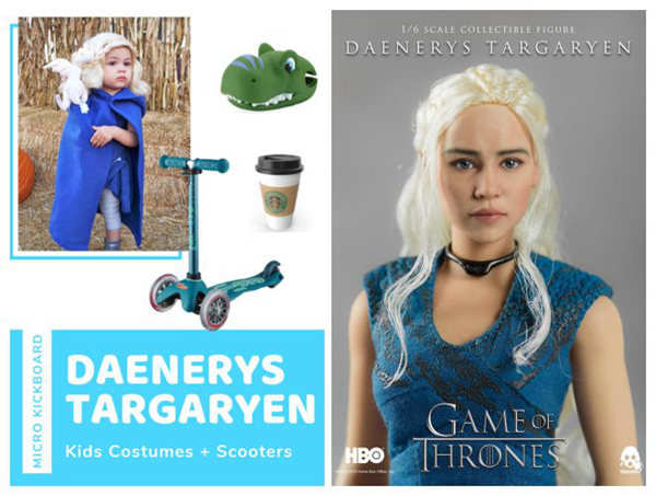 "龙母"丹妮莉丝·坦格利安无疑是剧中最具代表性的角色,让孩子打扮成“迷你龙母”的样子,带上心爱的火龙和冰蓝色的micro迷你豪华版滑板车,带领小团队一起去讨糖果吧~如果加上一杯星巴克咖啡作为装饰,也是满满的混搭感,毕竟剧外的“龙母”也是极爱星巴克的拿铁。