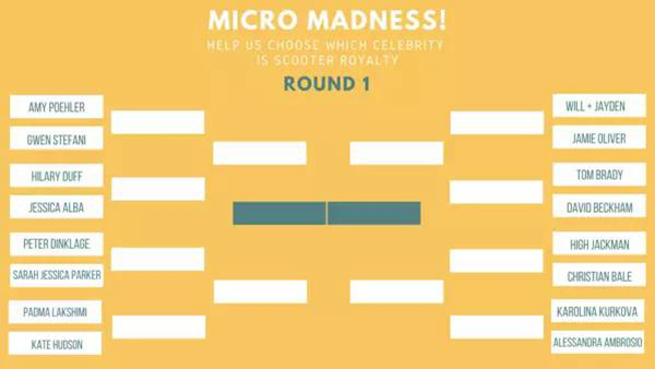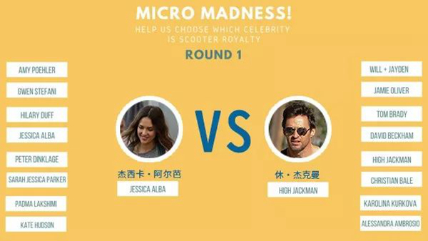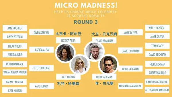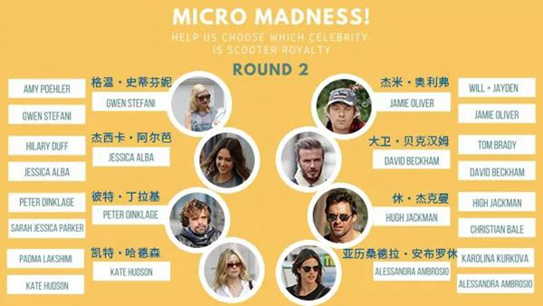 这16位入选名人们自己和家人平时都十分喜爱 micro滑板车,在粉丝们的激烈投票中,大家都十分看好休·杰克曼、格温·史蒂芬妮和大卫·贝克汉姆。第二轮投票过后,八强名单如下: