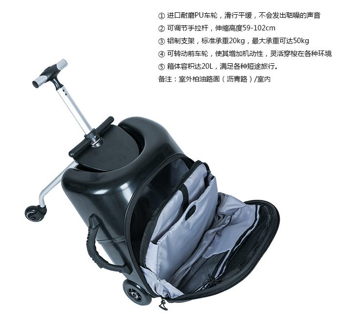 说起好用的行李箱,大家可能会不约而同说出瑞士micro米高,来自瑞士的高端品牌,在世界上受到很多人喜爱,得到了世界消费者的认可,瑞士micro米高懒人箱在外观和设计上具有卓越的领先品质,时尚独特的风格,结合新的技术设计,不仅保证产品的高品质和耐久性,还在舒适性和美观性达到最大化,micro米高做了很多年的滑板车了,所以当推出米高懒人箱的时候,确实很让人遐想,原来是这样的一个箱子啊,既可以坐它,又可以拉着的箱子,米高懒人箱的妙处在于,它既是一个小巧便携的旅行箱,又可以秒变为移动座椅,大人小孩都可以坐,它的座椅是根据人体工程学设计的,坐上去十分舒适,这款米高懒人箱的座椅面很光滑,还有一些人性化的小夹角设计,整体略微有一些座椅的凹陷感,不仅小孩子喜欢坐,就连大人都不想下来。当然,除了舒服,米高这款懒人箱还很安全,骨架采用坚固的铝合金设计,造型为三角形,还在拉杆上加了脚蹬和扶手,坐上去的时候手和脚都有支撑的地方,随时随地都能做到稳固自如,可以轻松支撑起50KG的重量,有这样一款懒人箱,完全可以坐出滑板车的那种酷劲。