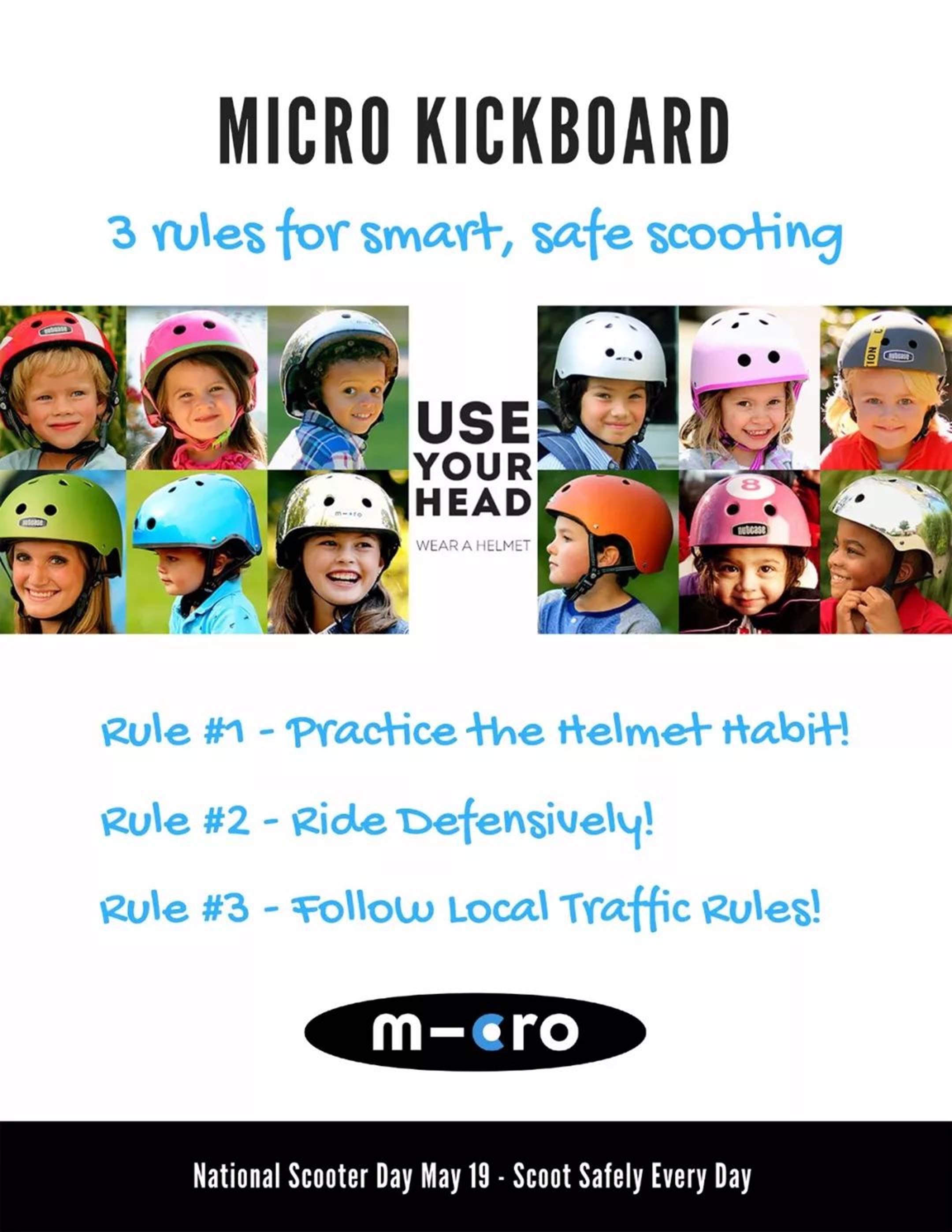 当然小编也没少提安全这个问题!在美国,每年的5月19日是全国的滑行日,在这一天micro的美国分公司庆祝的方式就是为大家普及安全知识。今年的滑板车日,micro美国在全美的学校发放安全教育海报。在海报中,我们从众多安全提示里浓缩提炼出3条基本准则,这三条准则容易记忆,可随时分享,易于操作。