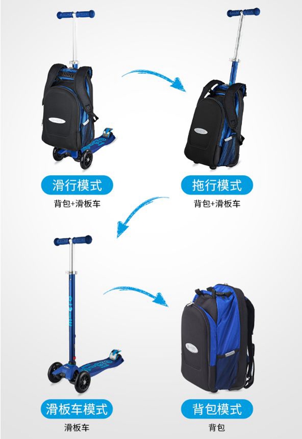 迷嬉四合一滑板车的最高承重达50KG,滑板车和背包的组合能适应不同场合。无论从背包模式切换成拉杆包,还是拉杆包切换成滑板车,切换方式都十分简单,只需要按几个按钮即可完成。一车多用,孩子能从5岁一直用到12岁,性价比实在杠杠的!