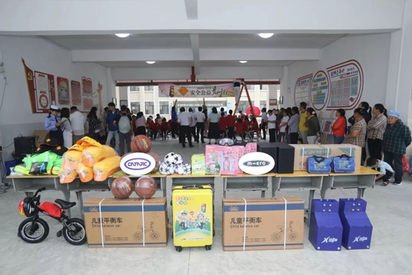 车队冒大雨为航龙小学带来了micro捐赠的蓝牙音箱、乒乓球桌、羽毛球网架、跳高垫、足球篮球等教学用具,以及安全小黄帽、安全书包等安全教育物资。