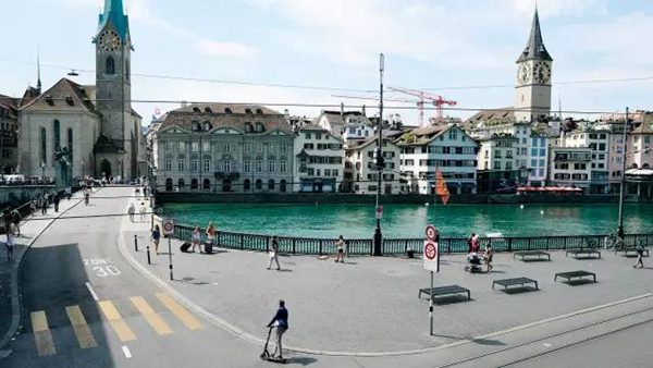 维姆·欧波特:苏黎世有非常密集的自行车道网络,而且允许骑行电动滑板车,这些都是微型交通的良好条件。总的来说,我的印象是,对自行车友好的城市对替代的和着眼于未来的交通工具更开放。然而,在绝大多数城市,汽车交通仍然占据了太多的空间,即使在苏黎世也是如此。在这里,开车去市中心,把所有的车都堵在一起是很正常的。在我们的城市里,汽车交通是以牺牲生活质量为代价的。我认为我们需要想出些新点子(来解决这个问题)。