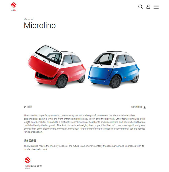 在红点设计奖的官网上,我们看到是这样介绍microlino的: