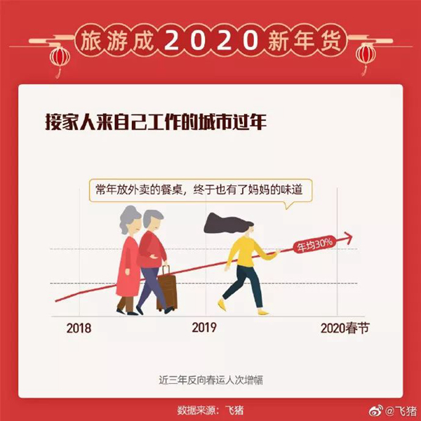 在飞猪的数据报告里,最温暖的莫过于反向春运。接父母来奋斗的城市过年的,两年来保持了平均30%的增幅。“亲情速递”过新春,常年放外卖的餐桌,也终于有了妈妈的味道。