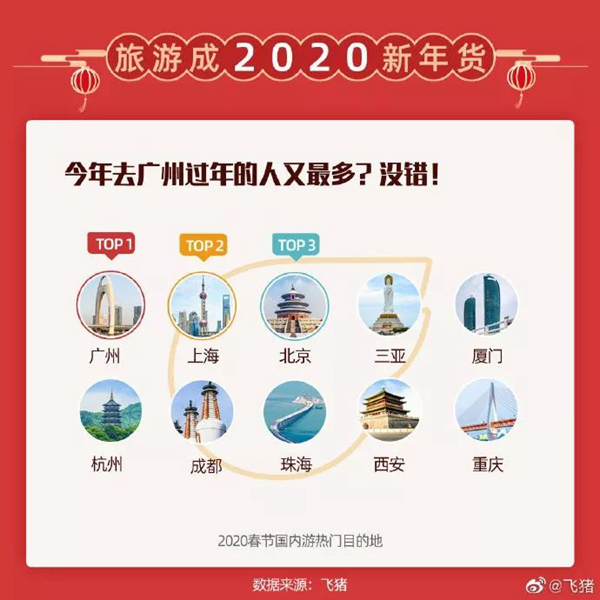 去年春节迎来游客大爆发的广州,今年应该依旧难见空城景象了。飞猪数据显示,广州仍然高居春节热门国内目的地排行榜首位。广东省内的珠海,以及去年大热的网红城市重庆和西安,都在前十名单中。