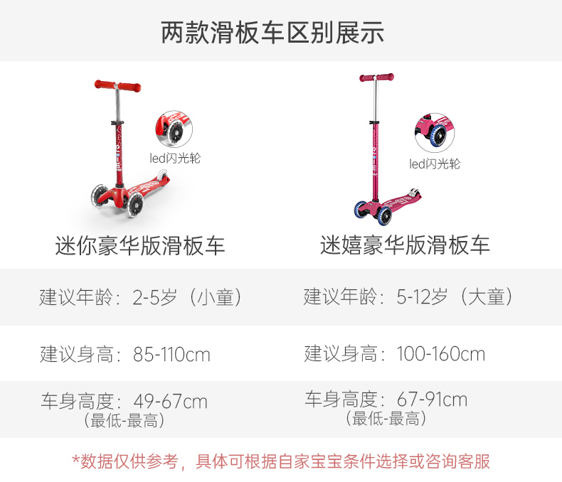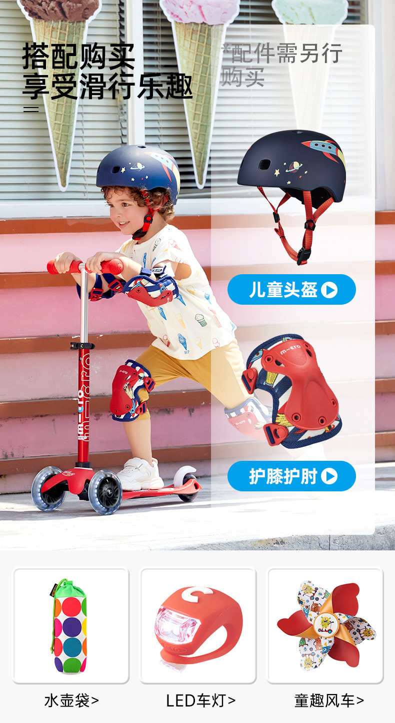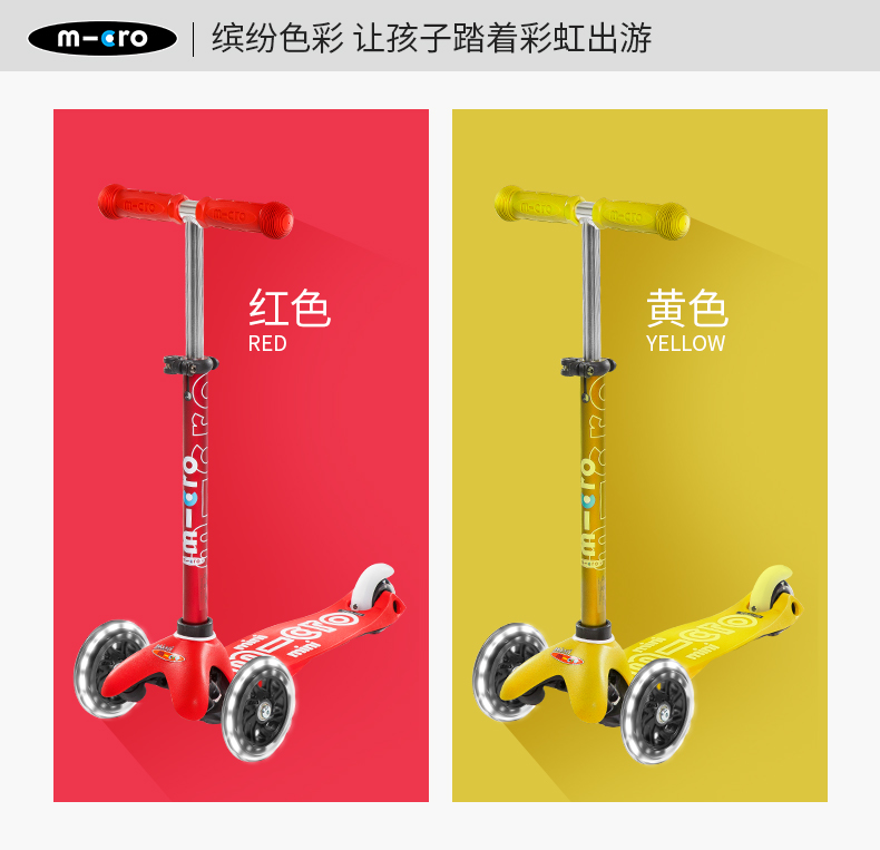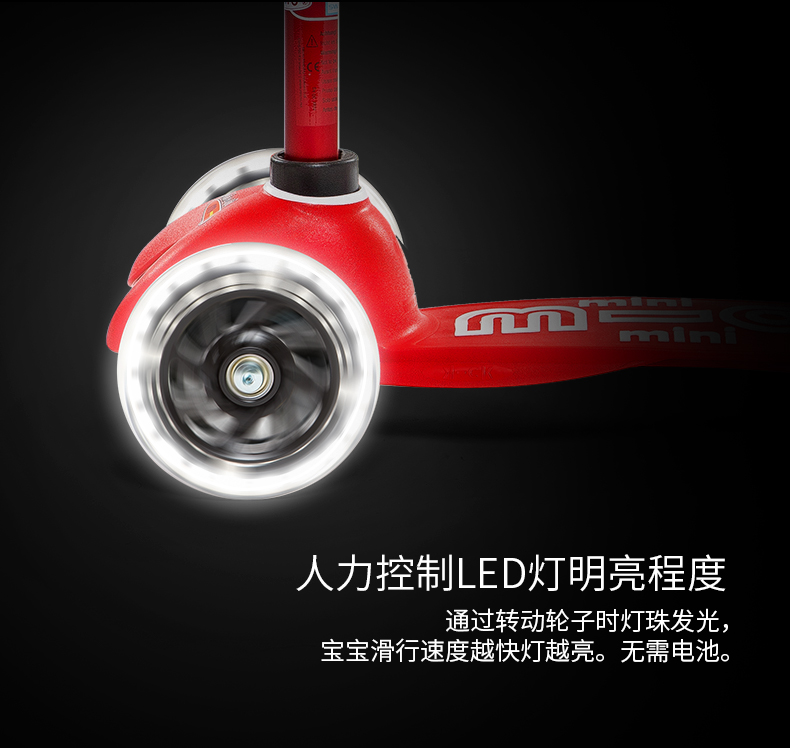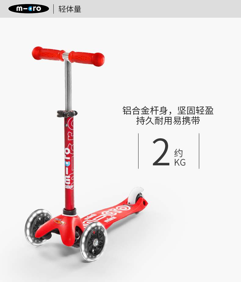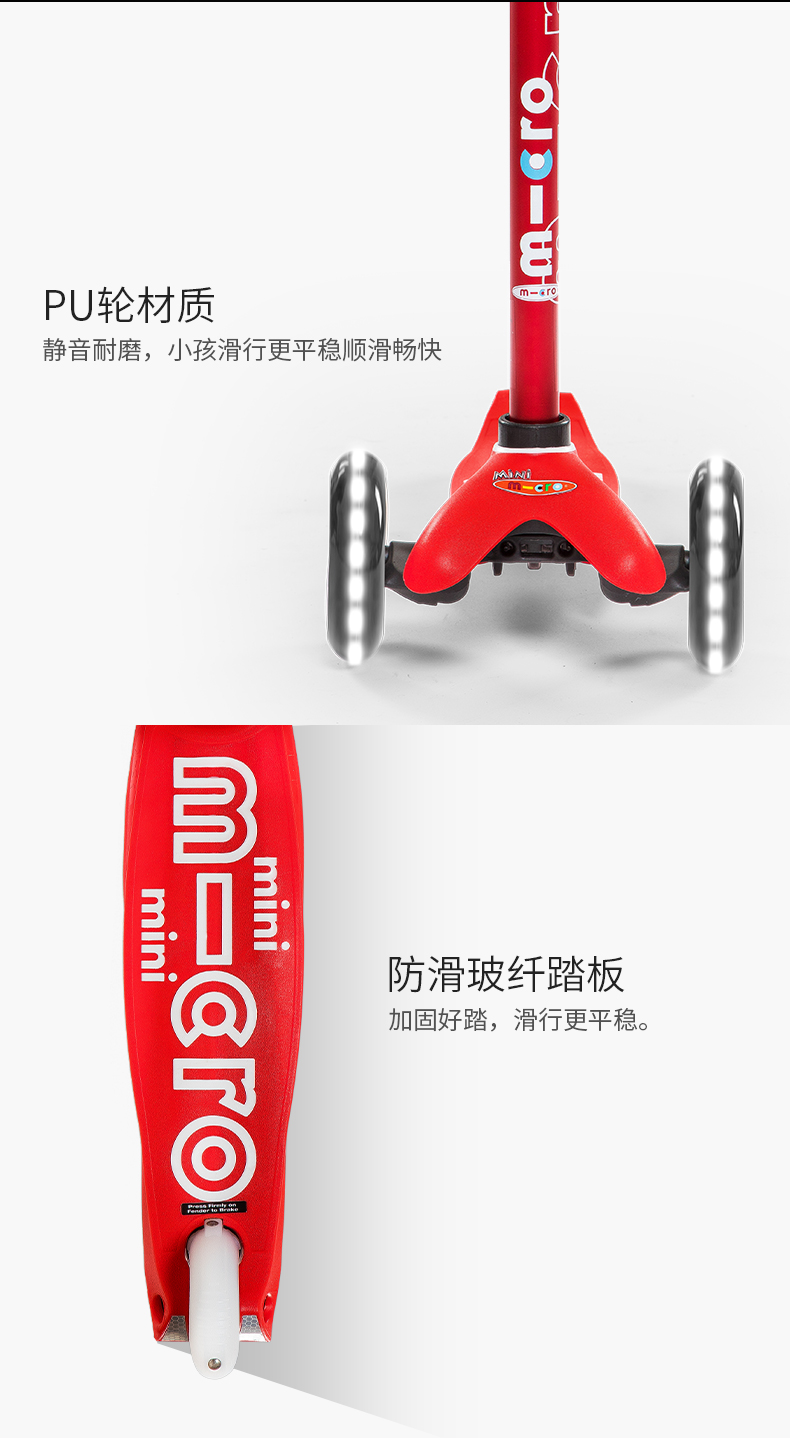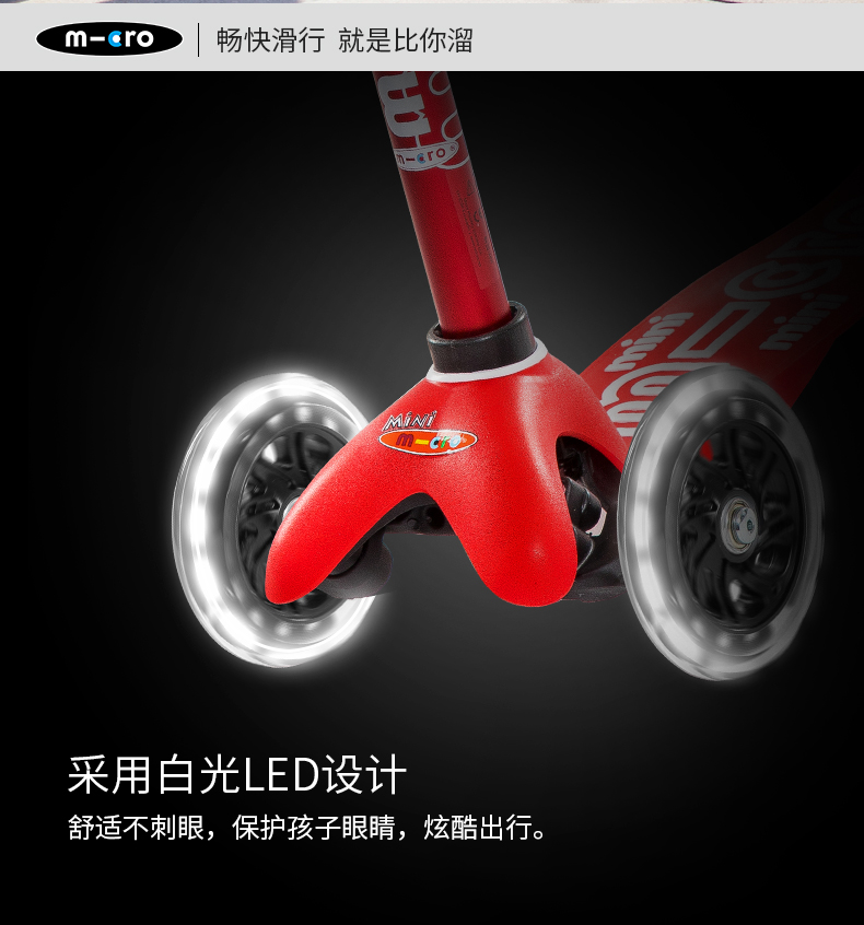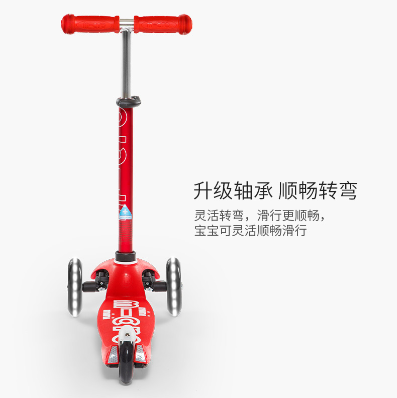 【LED车轮】瑞士m-cro迈古儿童滑板车德陆诗迷你滑行车可调节高度可拆卸儿童三轮闪光轮滑步车 红色LED白光车轮