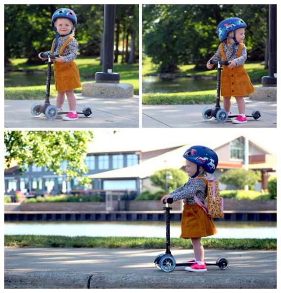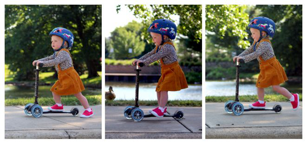 拍摄几张照片之后,我们的小模特似乎觉得是时候停下来或者慢下来了。她开始放下一只脚。迷你滑板车最大的特点就是它的踏板离地面只有1英寸(2.54厘米),所以孩子们可以很自信地跳上跳下,或者用脚踩住,而不用担心失去平衡。