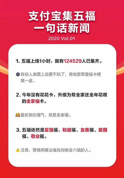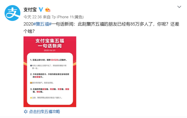 1月13日晚间,支付宝官方宣布此刻(22:36分)集齐五福的朋友已经有85万多人,并发布了2020年“集五福”一句话新闻,我们一起来看看。